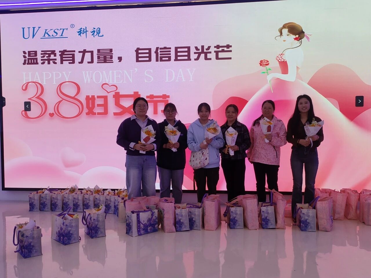 为了给女神们带来满满的仪式感,工作人员早早便开始了忙碌的筹备。3月7日的科视,一改往日的严谨,处处洋溢着温馨浪漫的气息。精美的礼品整齐排列成“3•8”形状,传达对女神节日的问候,它们不仅仅是礼物,更承载着公司对大家辛勤付出的肯定。娇艳的鲜花点缀其间,芬芳馥郁,正如科视女神们各自绽放的独特魅力。每一个细节,都经过反复斟酌;每一处布置,都蕴含着深情厚意。希望用这份看得见的用心,告诉大家:在科视,你的每一份付出,都值得被看见、被珍视。